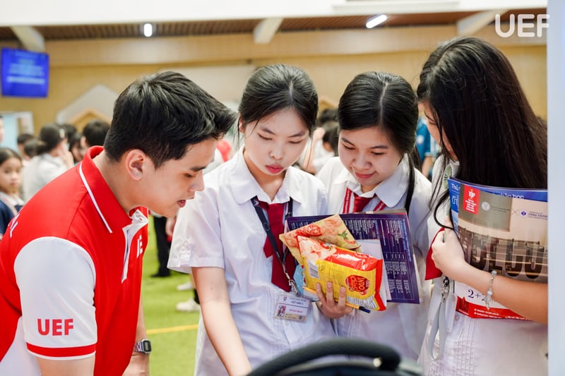 Bên cạnh các hoạt động trải nghiệm, gian tư vấn của UEF thu hút đông đảo học sinh khối 12 đến tìm hiểu về ngành đào tạo, phương thức xét tuyển và chính sách xét học bổng sớm dành cho thí sinh 2k8. Việc chủ động đăng ký học bổng từ sớm giúp giảm áp lực thi cử, mở rộng cơ hội tiếp cận ngành học mong muốn và tạo điều kiện để học sinh xây dựng lộ trình học tập phù hợp cho chặng đường đại học sắp tới.